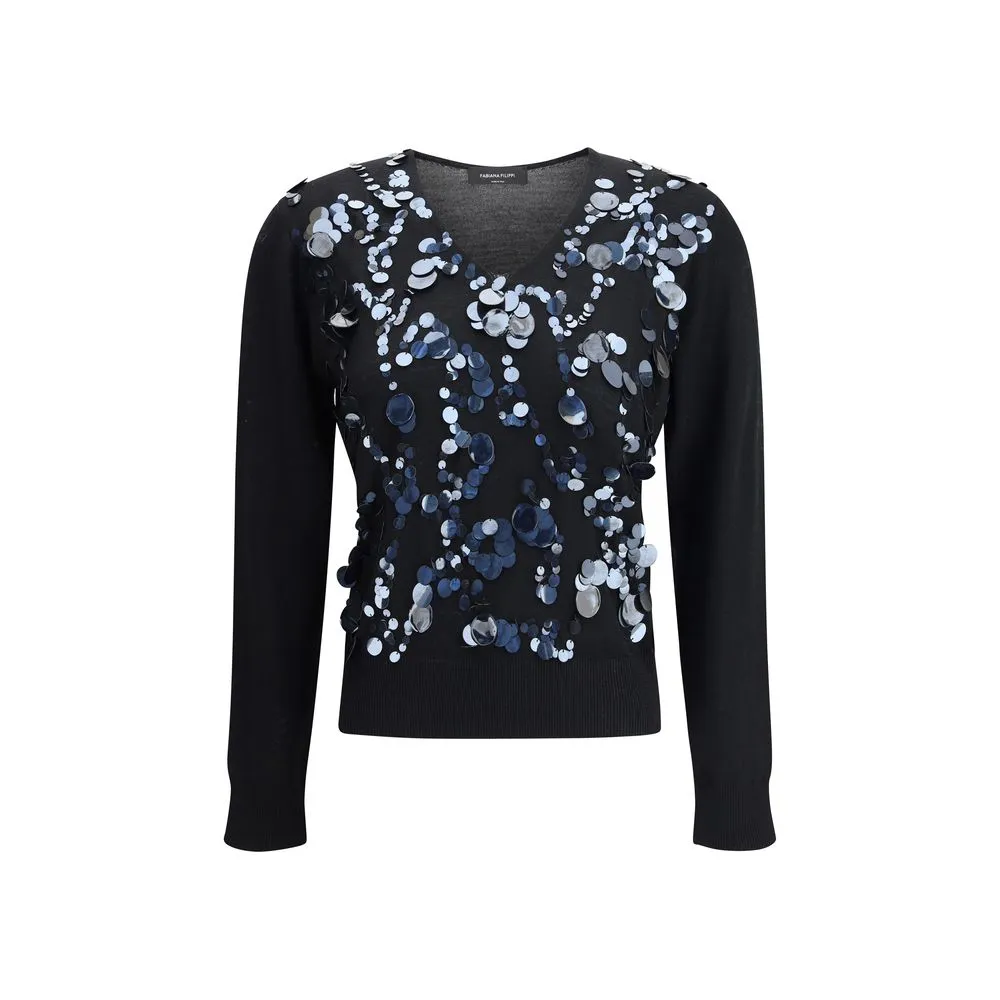 Fabiana Filippi’s Sweater is embellished with maxi sequins applied on the front, giving a touch of light and originality. It features a V-neckline and ribbed trim on the cuffs and hem for a feminine and sophisticated silhouette.