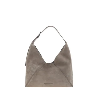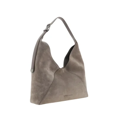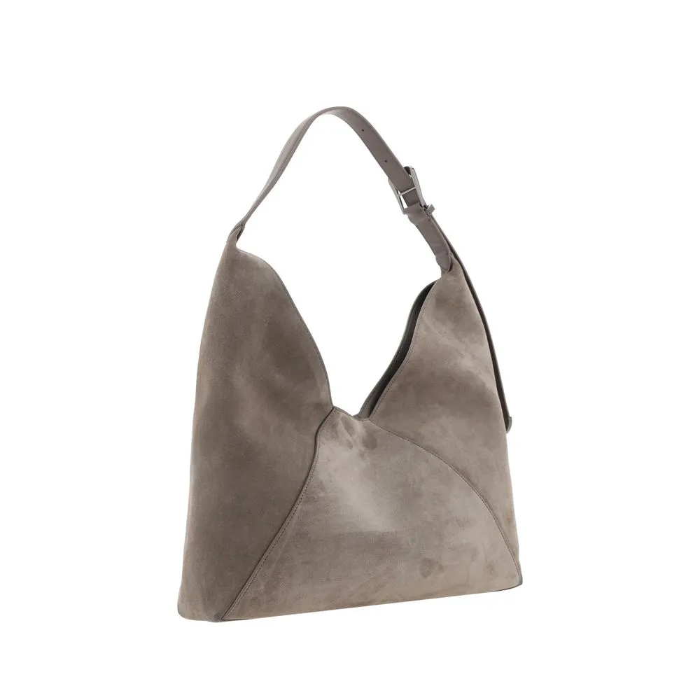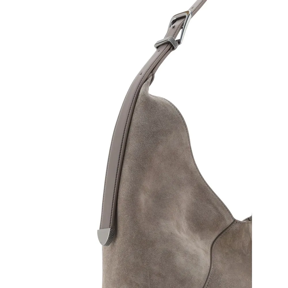 Leather Shoulder Bag by Brunello Cucinelli featuring an adjustable flat shoulder strap at the top, a suede paneled design, a top magnetic button closure, a single compartment, and the brand’s iconic monogram embossed at the front.