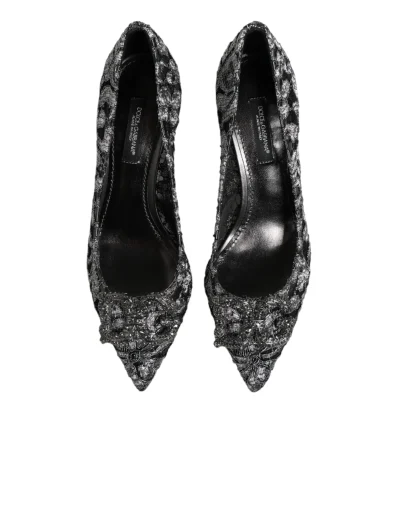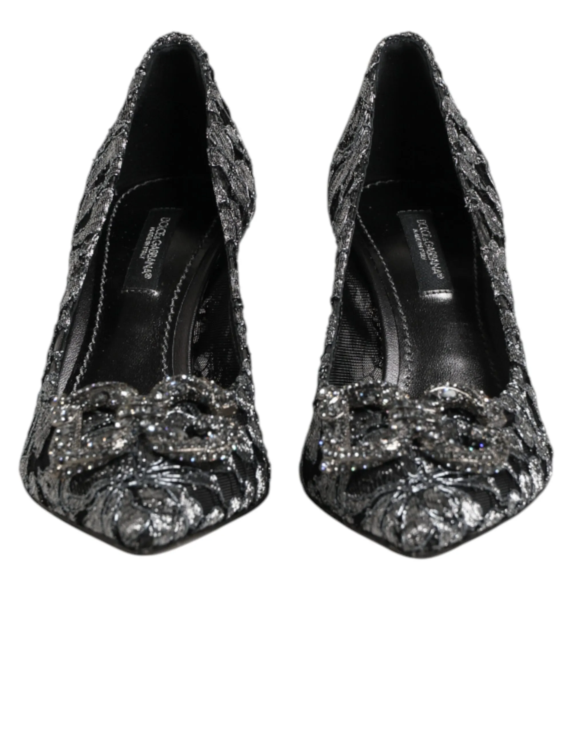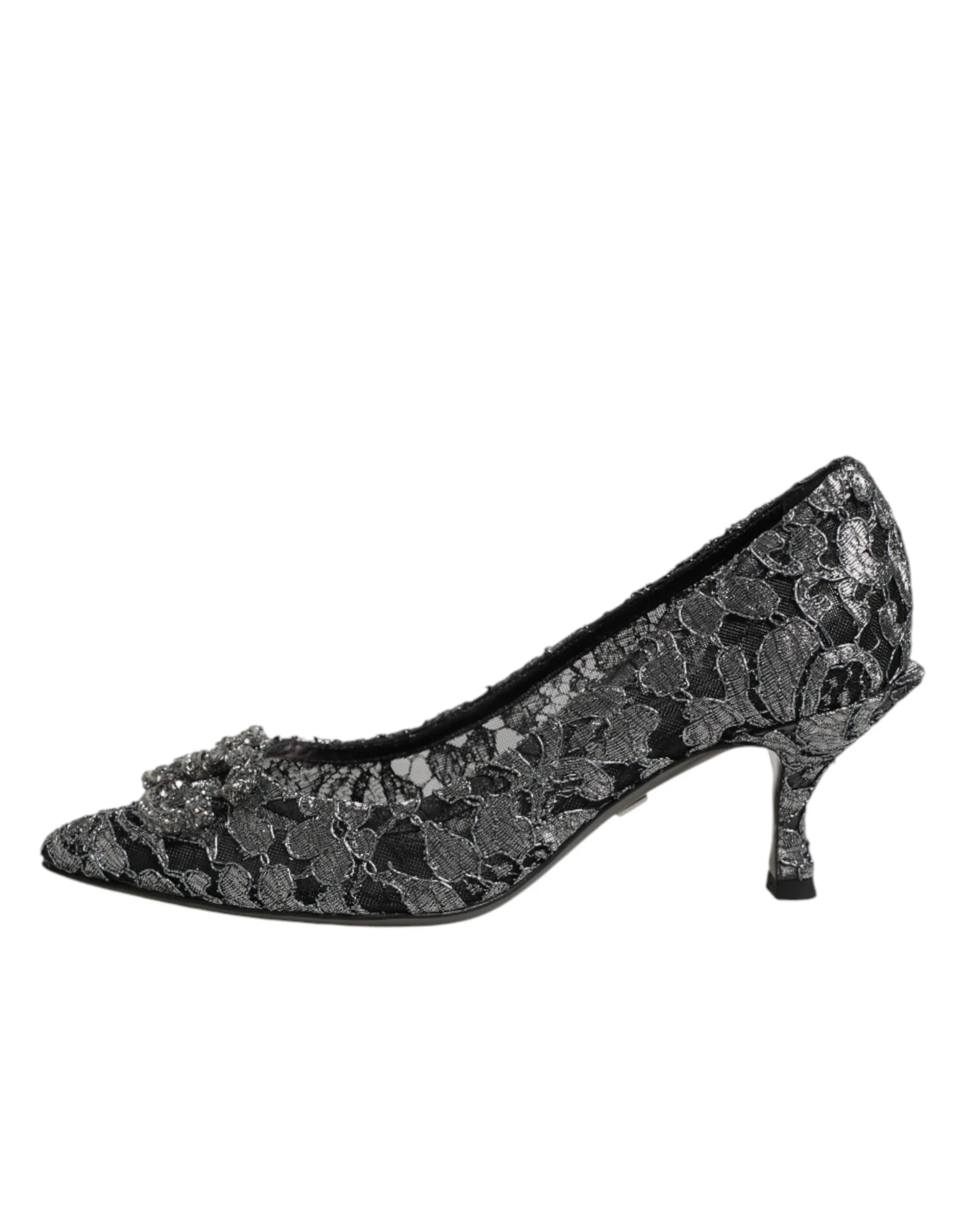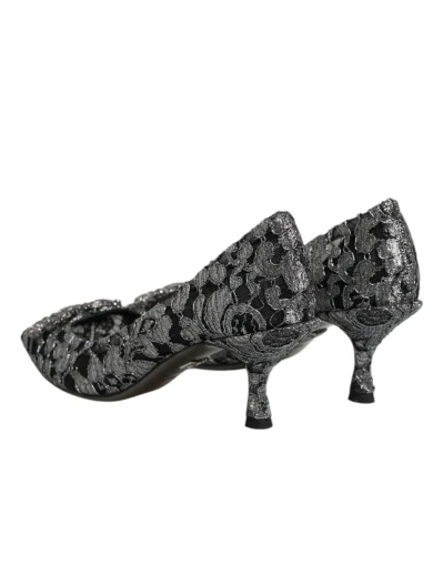 pumps feature delicate silver lace with a shimmering finish. The design is elevated by the iconic DG Amore heart-shaped heels, adding a touch of glamor and sophistication. Perfect for evening wear or special occasions, they embody timeless Italian luxury.