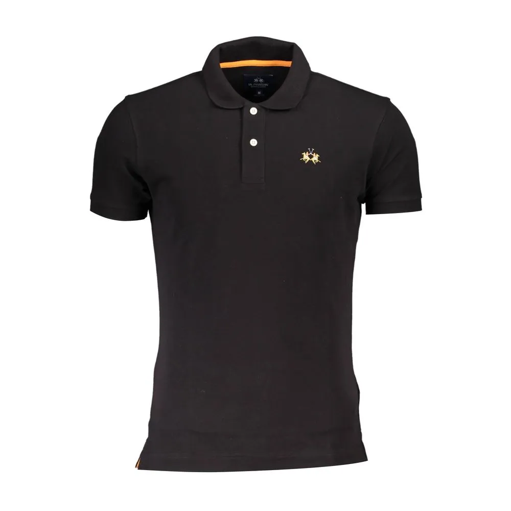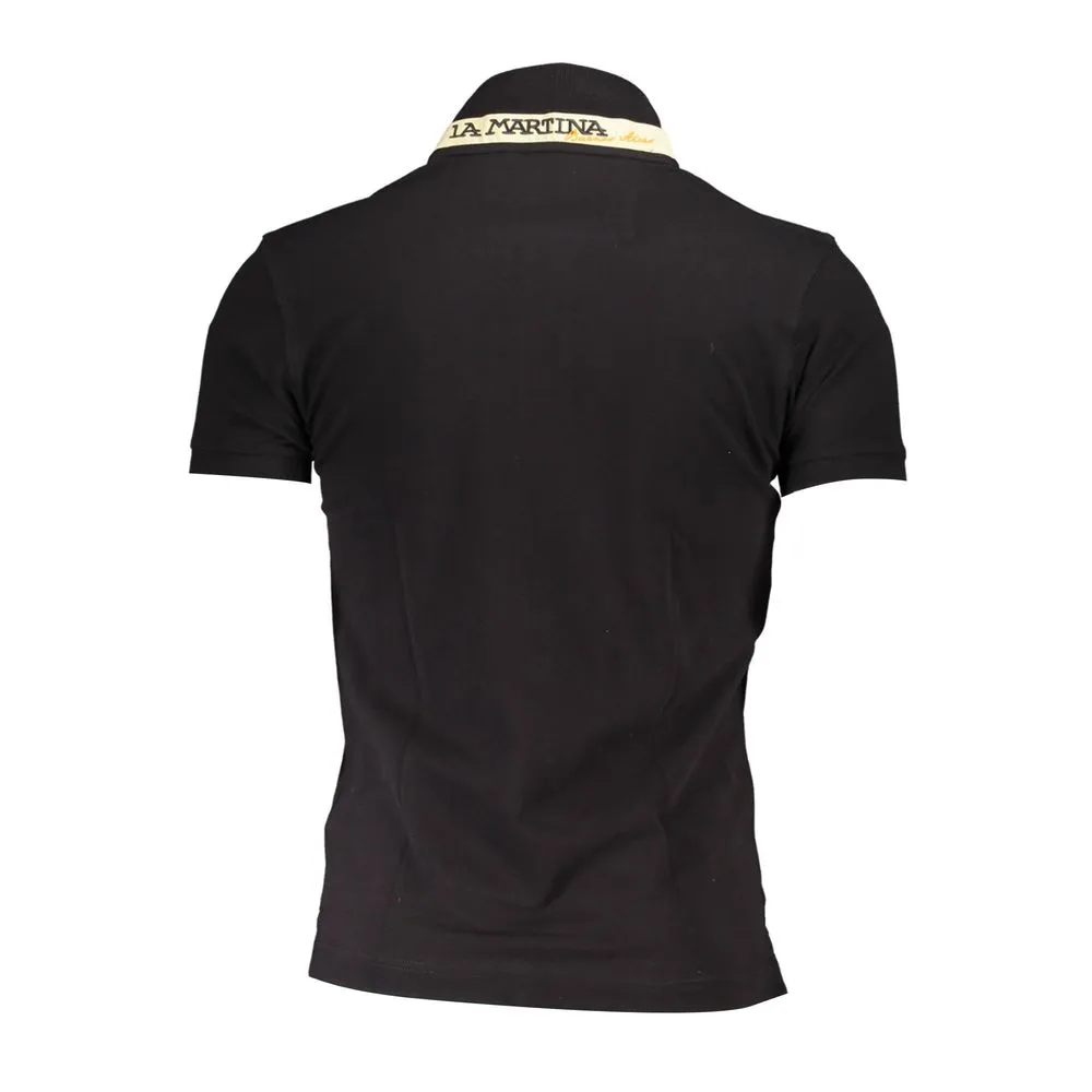 Experience the perfect blend of comfort and style with our La Martina polo shirt. Designed with a smart slim fit, this short-sleeved polo is accentuated with contrast details and iconic logo embroidery. Crafted from a high-quality mix of 95% cotton and 5% elastane, it promises both durability and stretch for the ideal fit. The classic black hue paired with a neat two-button placket ensures this piece is a versatile addition to your wardrobe, seamlessly taking you from a casual workplace to social evenings.