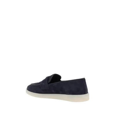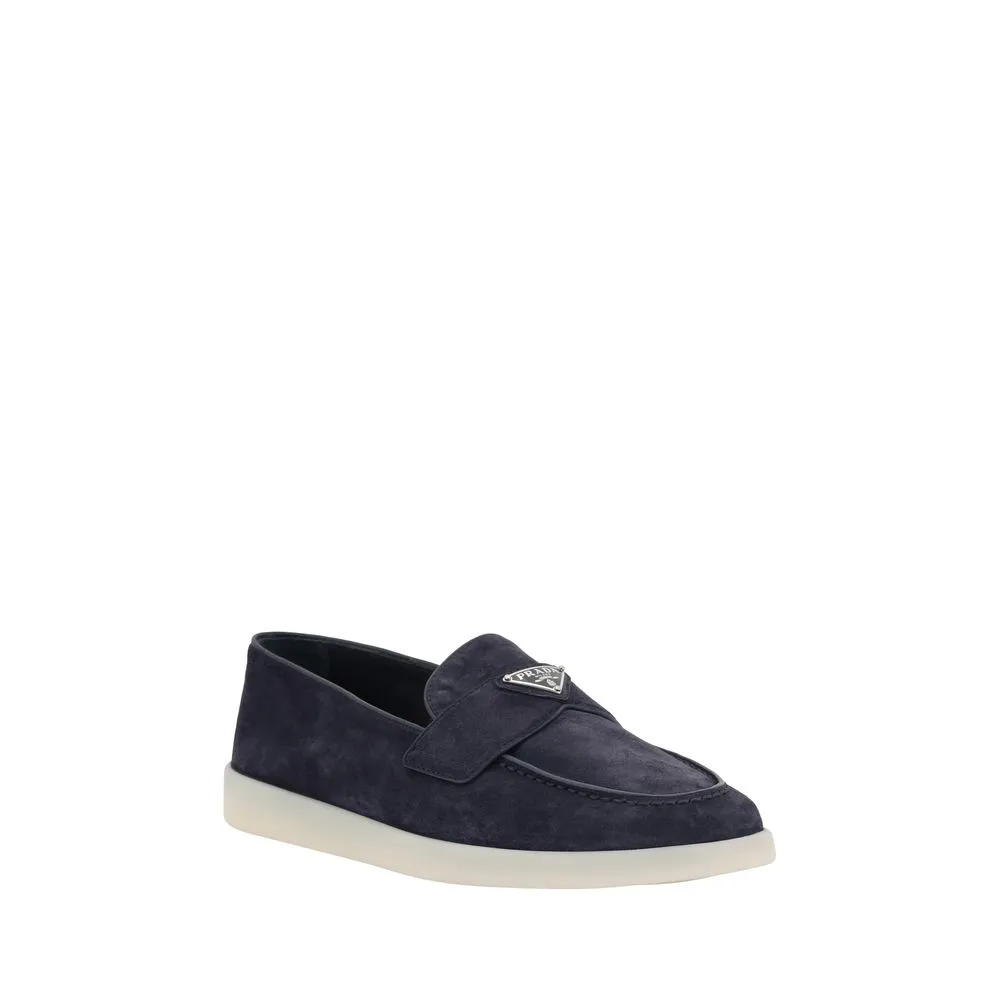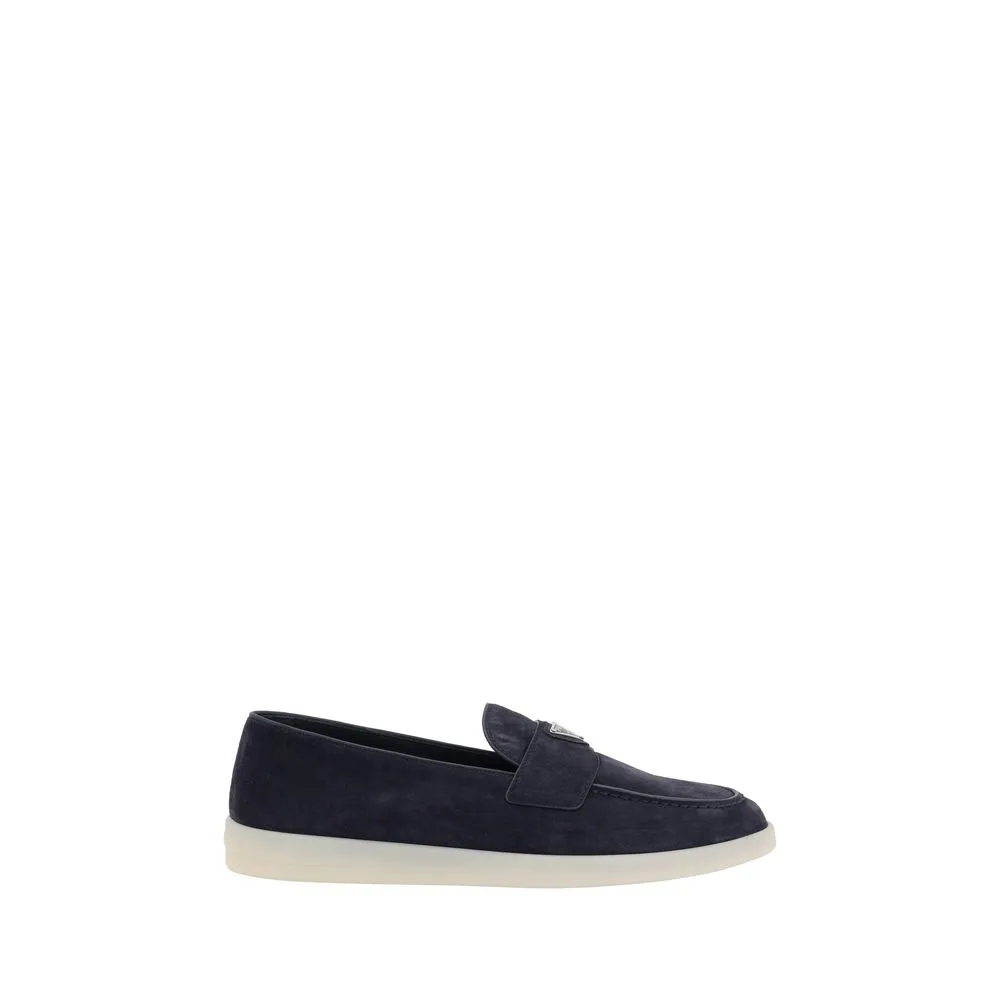 Prada’s leather Loafers feature an almond toe and a suede design that lends a touch of sophisticated elegance. The contrasting flat sole and front tray embellished with the brand’s iconic triangular plaque add a distinctive detail. The logo-embossed insole completes the look, making these loafers a refined and versatile accessory.