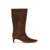 Staud’s suede Wally Boots embody a bold, modern elegance. Featuring a slightly shorter shaft that stops at calf height, they are distinguished by a sleek silhouette with a sharp toe and slim heel, elements that lend a sophisticated and feminine profile. Made of soft suede, they are designed to stylishly complete both daytime looks and evening outfits.