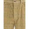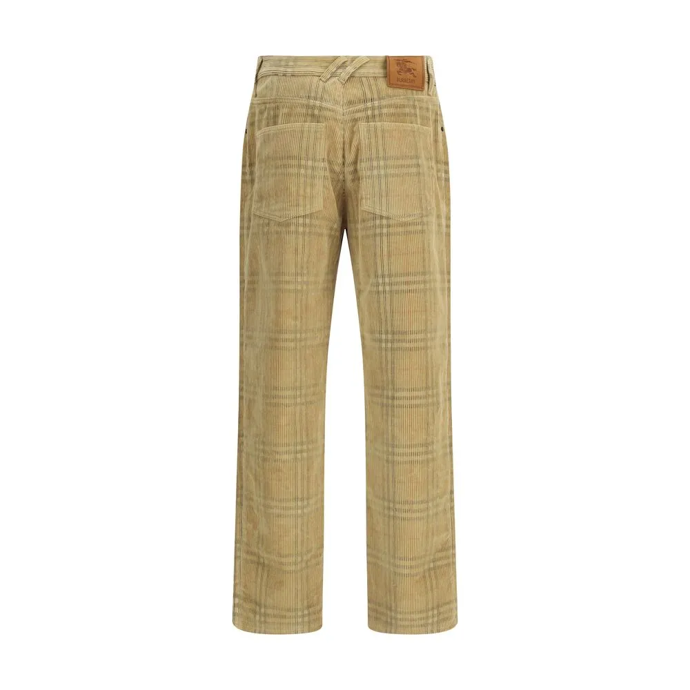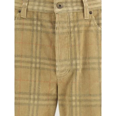 Burberry cotton Pants with a velvet ribbed design, embellished with the iconic Archivio Check motif. Five-pocket model, front button fastening and belt loops at the waist. The garment is completed by a logo leather patch applied on the back, a distinctive detail of the brand.