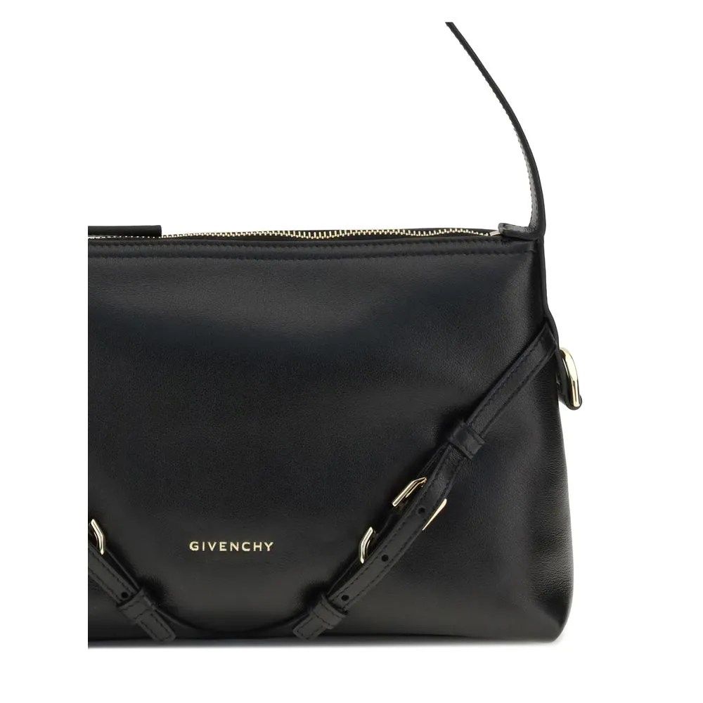 Voyou mini Shoulder Bag by Givenchy is a compact and sophisticated accessory made of smooth leather. Featuring a zippered closure, it features an adjustable strap for comfortable shoulder wear. Embossed GIVENCHY signature decorates the front, while the interior is embellished with the GIVENCHY Paris applique. GIVENCHY-engraved metal buckles and gold-tone metallic details complete the design. The main compartment offers essential space for daily essentials.