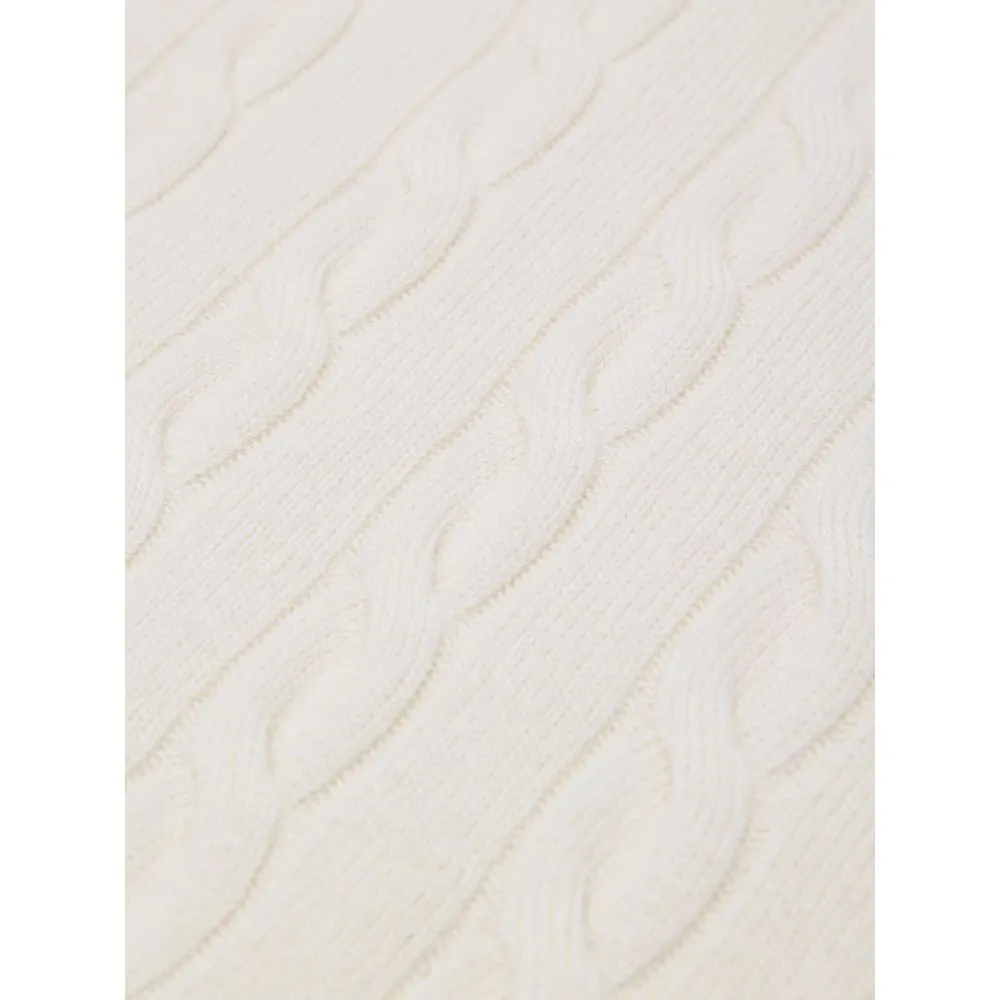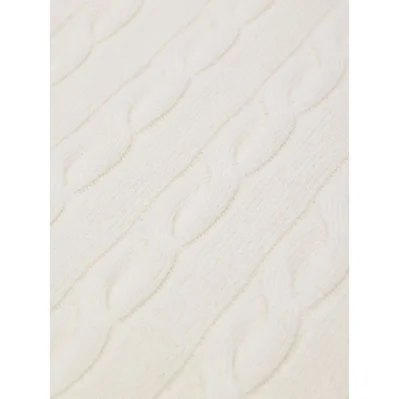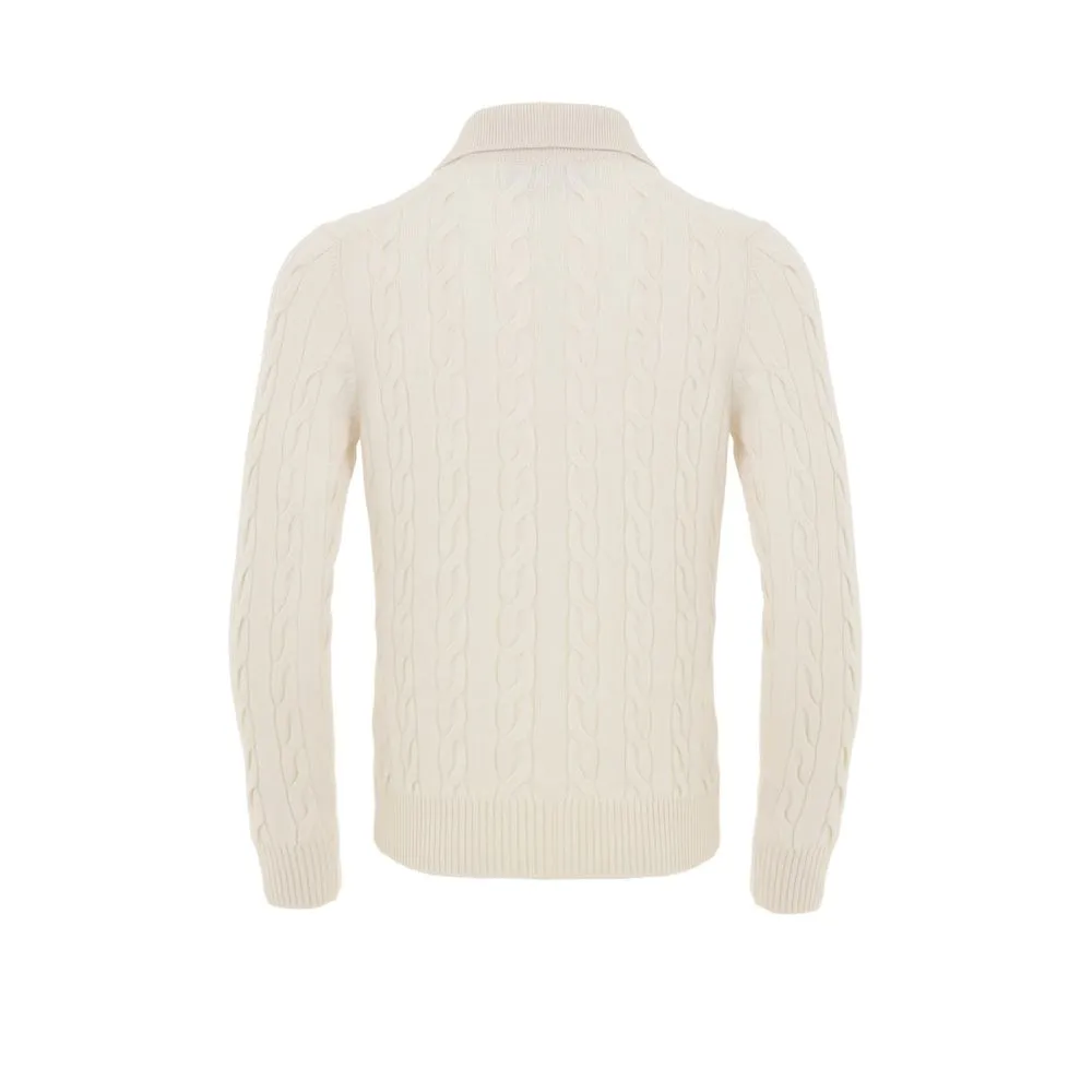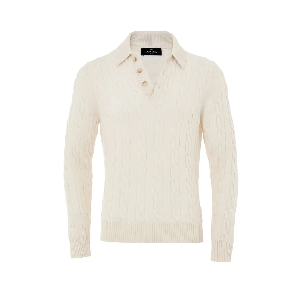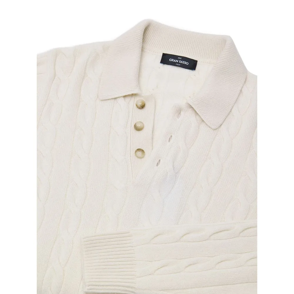 Gran Sasso White Cashmere V-Neck Sweater. Buttoned V-neck, classic shirt collar, allover cable knit, soft feel.