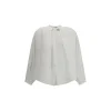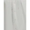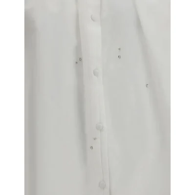 Forte_Forte’s Voile Shirt with embroidery is a romantic and sophisticated piece, featuring a mandarin collar and a front button closure. The puff sleeves give volume and femininity, while the delicate dragonfly embroidered on the front with beads adds a precious detail. The entire blouse is embellished with an elegant all-over rhinestone effect, giving it a touch of discreet and refined shine.