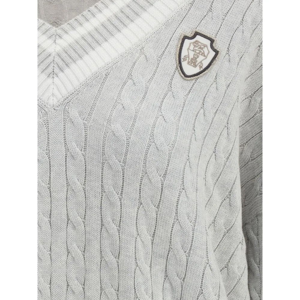 The V-neck sweater by Brunello Cucinelli blends casual elegance with artisanal sophistication. Crafted from soft cotton with a textured pattern, it features convenient patch pockets that enhance its relaxed appeal. The iconic Solomeo heraldic crest on the chest evokes the maison’s sport club spirit, turning a timeless essential into an emblem of understated refinement.