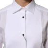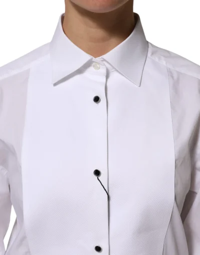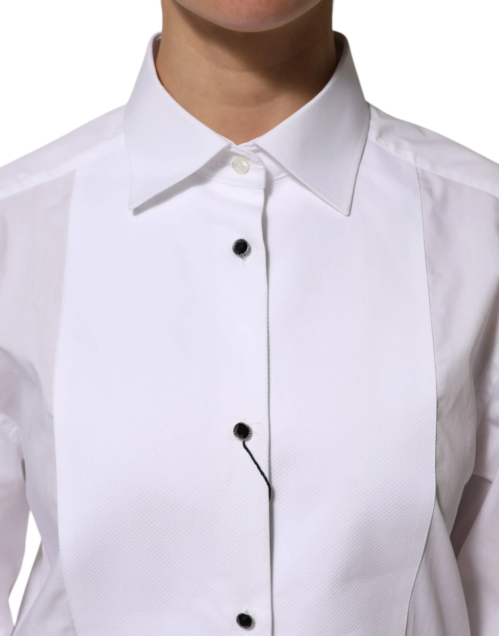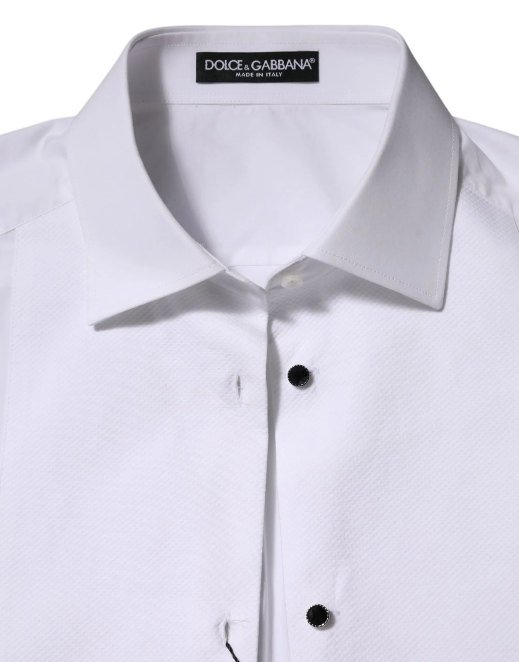 Gorgeous brand new, 100% Authentic Dolce & Gabbana white tuxedo-style shirt is tailored in Italy from 100% crisp cotton. Designed with a classic point collar, black stud buttons, and a pleated bib front, it’s the perfect piece for formal and evening occasions.