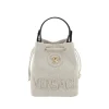 La Medusa Bucket Bag by Versace, top closure via adjustable drawstring, one flat shoulder strap, iconic brand monogram stitched on front, plaque with iconic brand Medusa logo applique on front, single interior compartment.