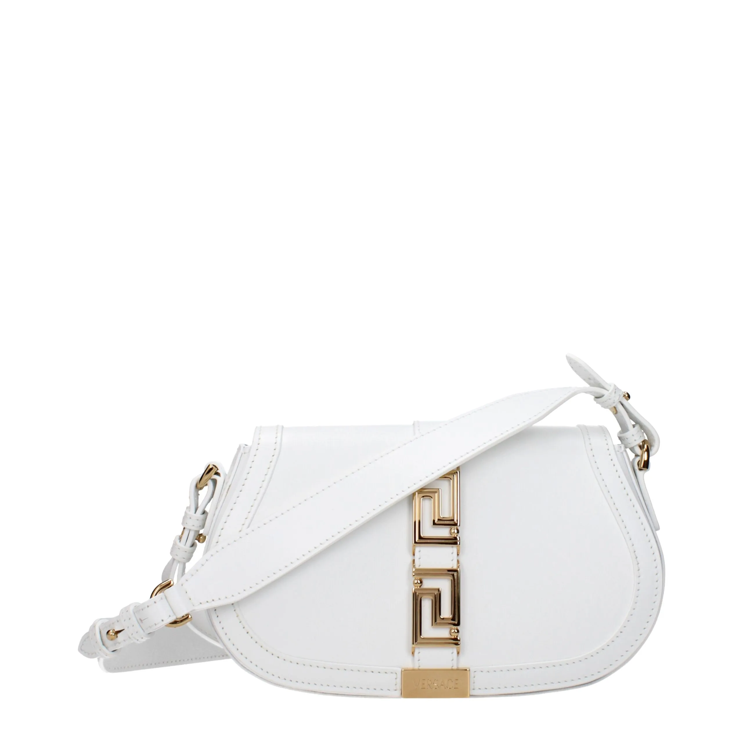 The product with MPN 10071281A051341W00V and code F80291 leather in white is a crossbody bags designed by Versace. It has features like front logo, adjustable shoulder, removable shoulder.