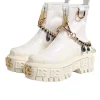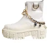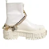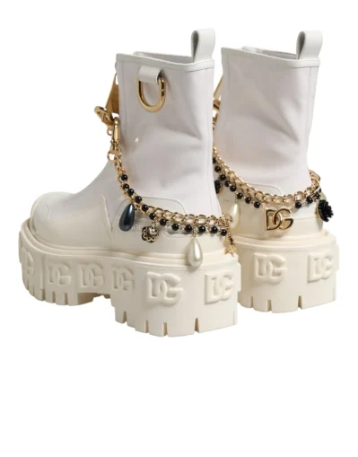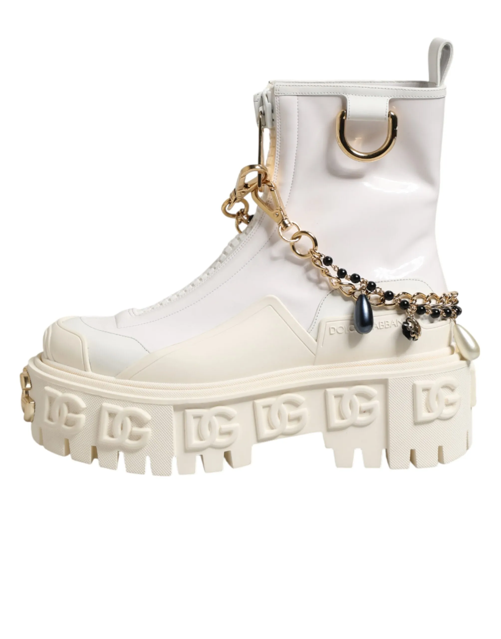 ankle boots are crafted from smooth white leather, accented with a bold rubber DG logo for a contemporary edge. Featuring a chunky rubber sole and pull-on design, they blend luxury with streetwear appeal. A stylish and durable choice for modern, fashion-forward looks.