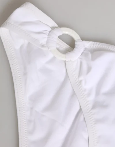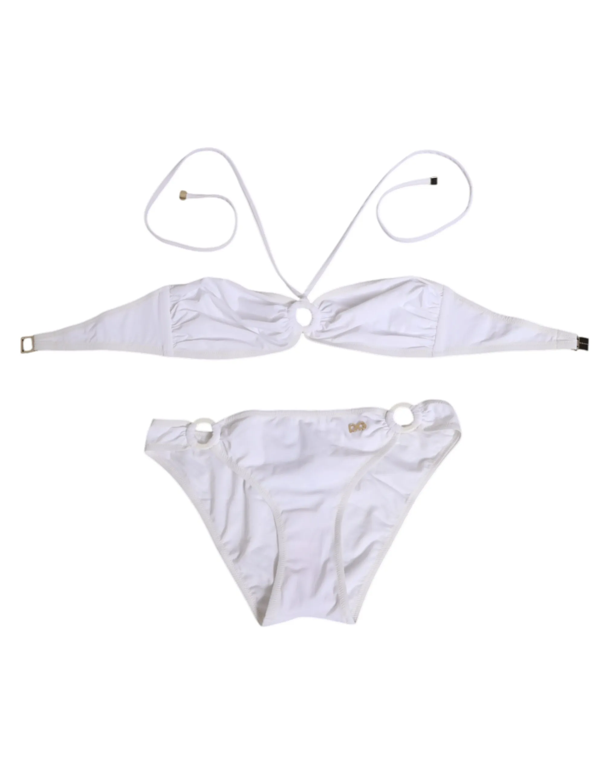 Gorgeous brand new, 100% Authentic Dolce & Gabbana two-piece swimsuit features a crisp white design accented with the signature Dolce & Gabbana logo. Complete with a matching top and bottom, it offers a sleek and modern look for stylish beach or poolside wear.