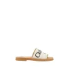 Cotton Woody Sandals by Chloé, square toe, flat sole, branded insole, double front fabric band with iconic brand signature printed in contrast.